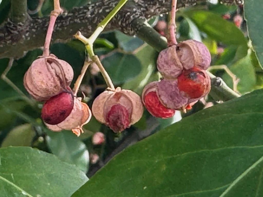 I walked around to look for seed pods…and anything else interesting in the plantings around the boathouse. The beautyberries were shriveled but still retained some color. A bush trimmed to keep it within the bed displayed a cracked stump. The browns and off-white colors dominate in winter but there were some green leaves of some bulbs coming up in one bed.
