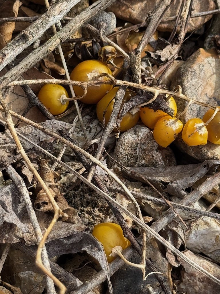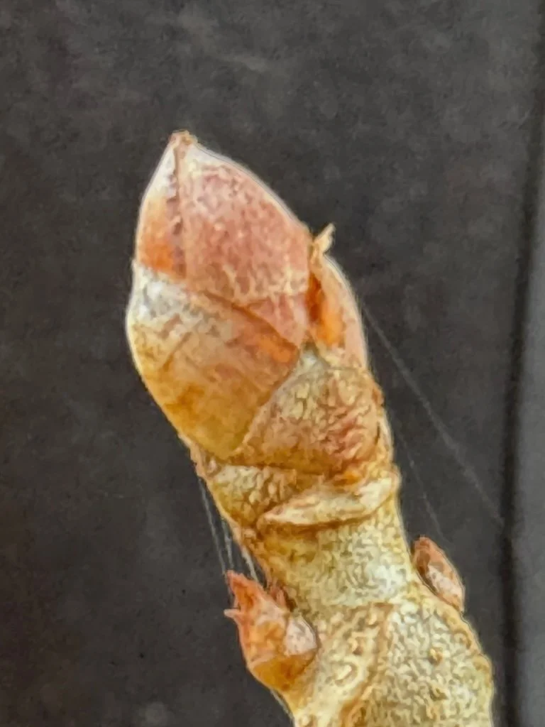 I put on my river boots to walk around the yard as the snow melted last week. I was glad to see the recently cut stump of the Callery Pear looked like it was rotting; I’ll be continuing to cut it until it is dead; the stems have thorns! The horse nettle fruits from last fall are a bit of color in the flower bed. An oat leaf blown from our neighbor’s tree was a point of interest in a snowbank on the far side of our yard. The forsythia in the northwest corner of our yard is another project where the pruning chainsaw will be used.