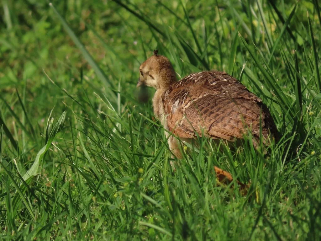 Peachicks. I had never seen a peachick before and had walked more than halfway around the Dickerson Park Zoo in Springfield, MO before I spotted three peachicks with a peahen. Celebration! The young birds already had the beginning of the topknot on their heads but none of the iridescent color.