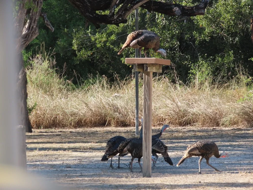We opted to take the tram to get an overall view of the park and then get off at the bird feeding station closest to the visitor center. The tram stopped long enough for me to photograph a feeding station dominated by turkeys.