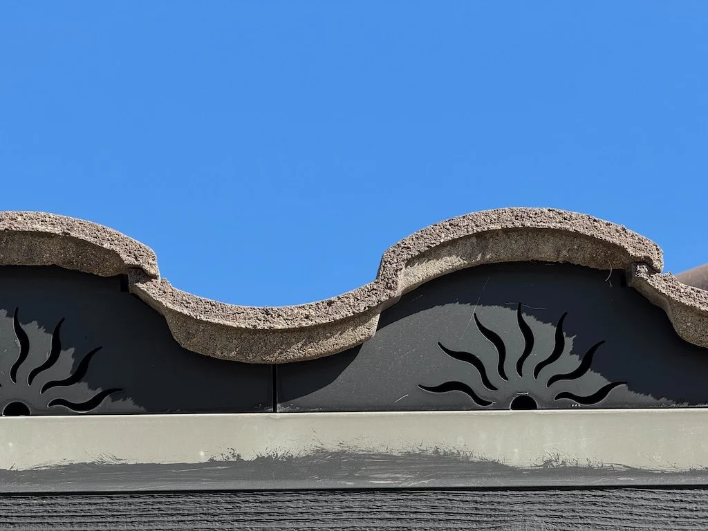 It was the first time for me to visit the memory care facility since my dad moved there. They were holding their Thanksgiving dinner that afternoon – the Friday before Thanksgiving. The day was warm enough that Dad and I walked outside in the enclosed courtyard beforehand. I noticed the decorative patterns on the roof of one of the pavilions.