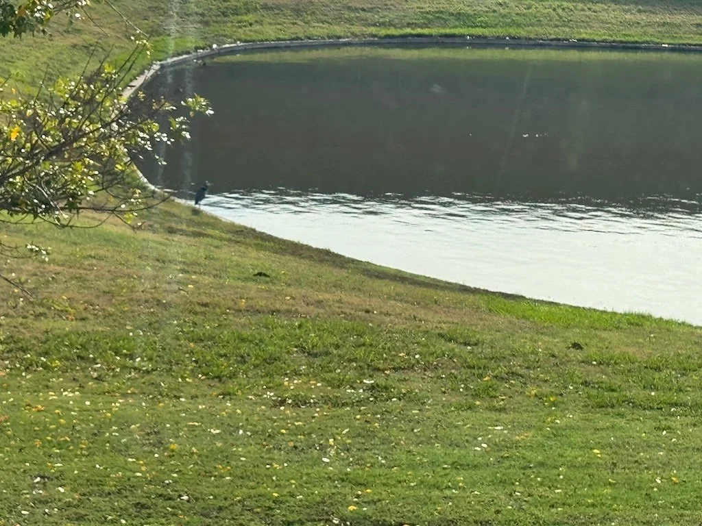 The next morning, I was up and looked out the window a little after sunrise. My hotel window overlooked a storm water pond; on the other side of the pond was a Costco…and then a cluster of overpasses – an intersection of big highways. I was just far enough away that the highway noise did not overwhelm the white noise of the heating/air conditioning fan. A great blue heron was at the edge of the pond. Next time I will bring a better camera and maybe walk around the pond.