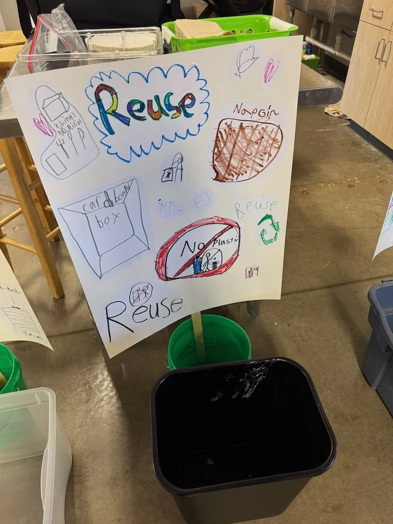 We (the adults) moved to a classroom with tarps over tables and on the floor which would be used for sorting by students over 3 class periods. The third and fourth graders divided into 4 groups and used the tarp covered table for the non-plastic and plastic trash respectively while the second graders used the floor tarp to sort reuse/recycle.