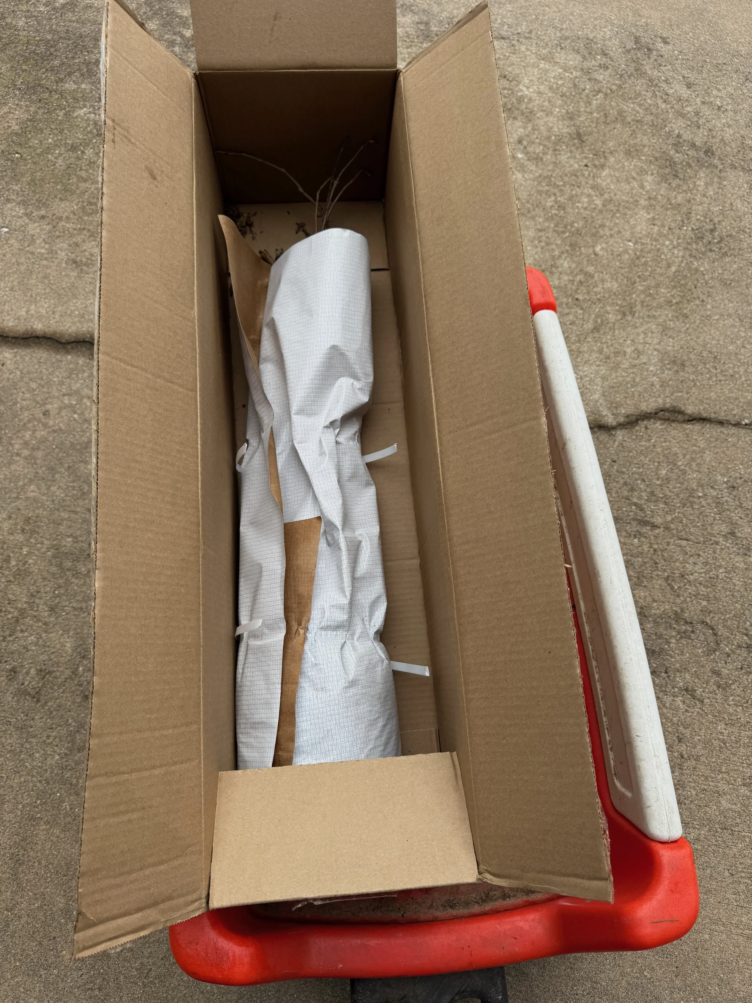The box came in the evening, and I opted to plant the next day. They came in a box wrapped in paper backed plastic held in place with ties. The tops of some were showing at the top.