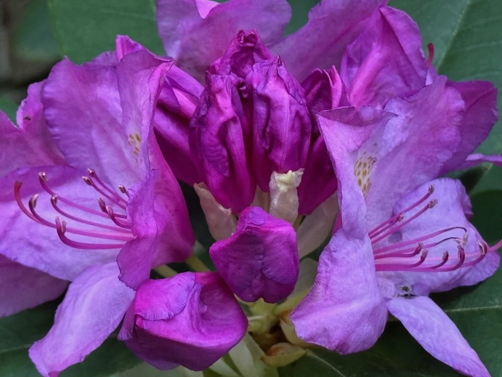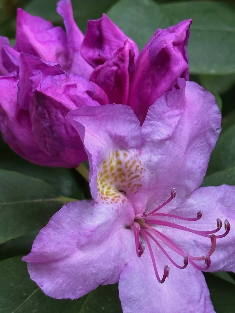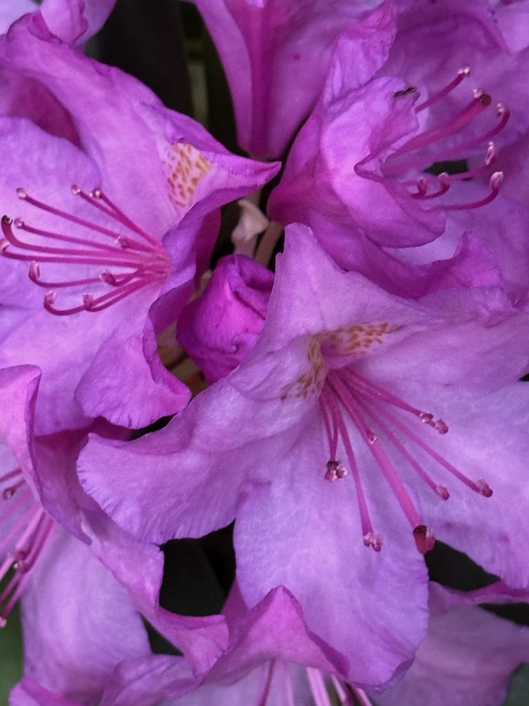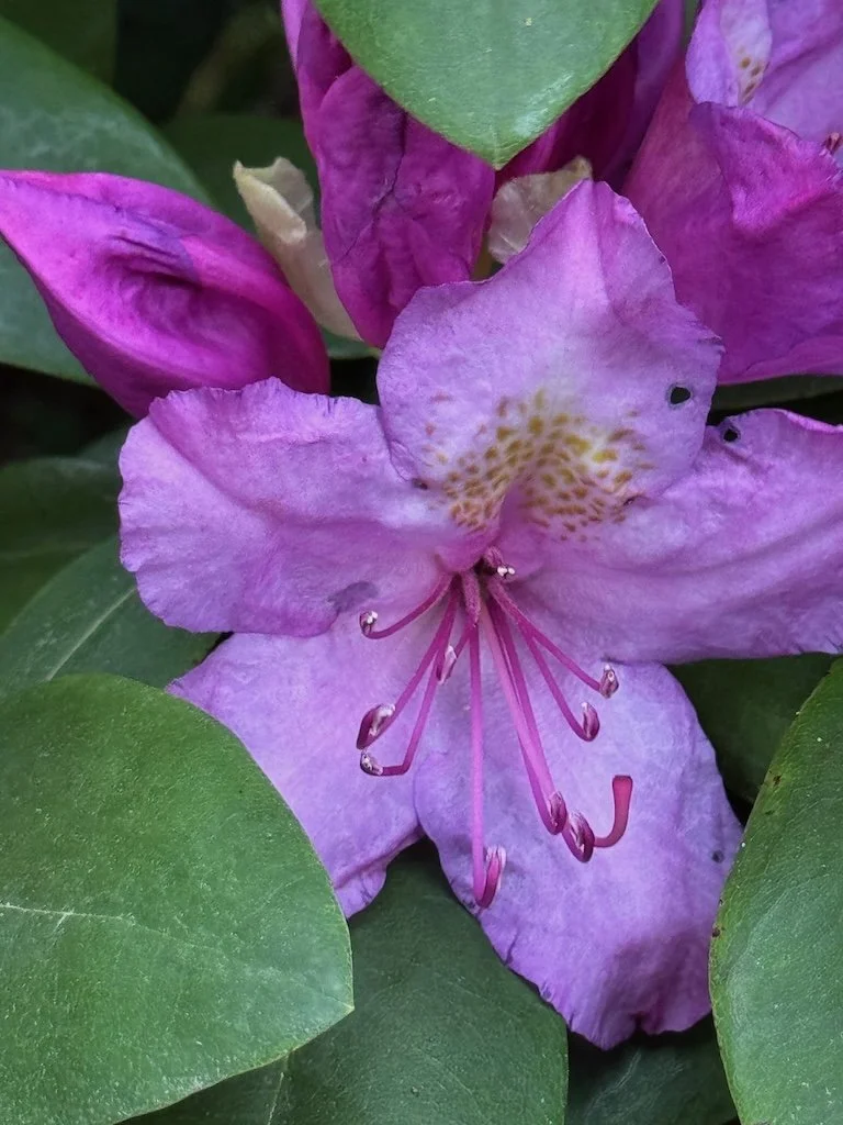 /The big rhododendron bush just outside my office window is in full bloom. I love to take pictures when there are still some buds….and other flowers fully open. I like the luminescence of the flowers, and the pollen sometimes looks like gold. It is probably a cultivar of the rhododendron native to North America….but not to Missouri.