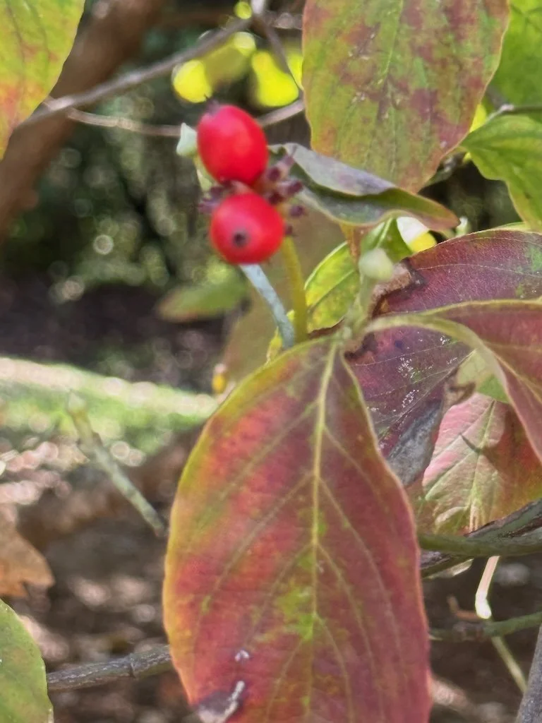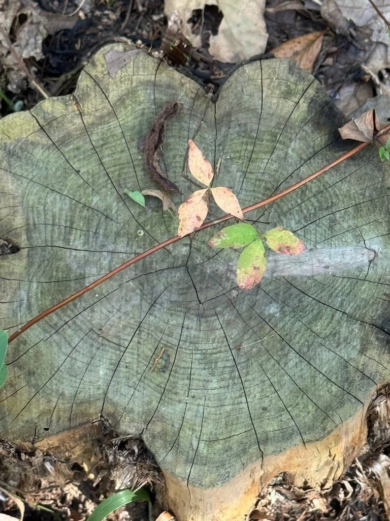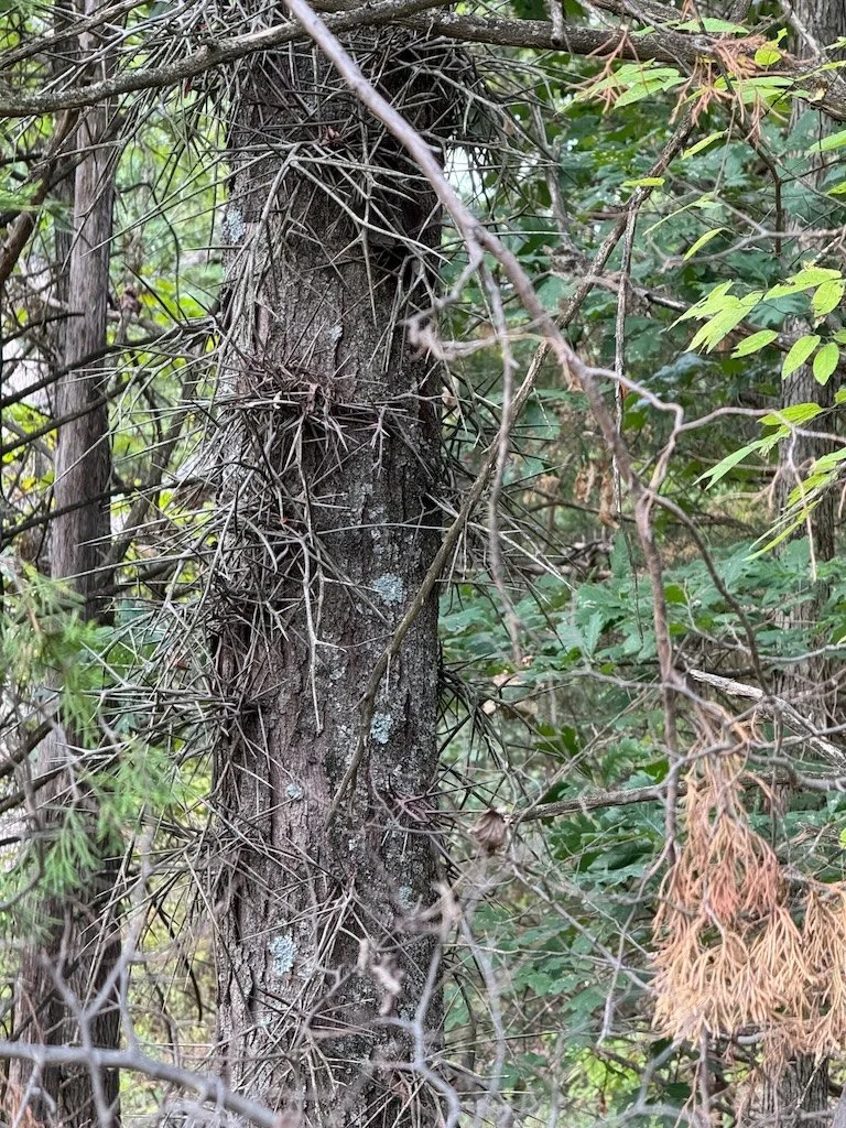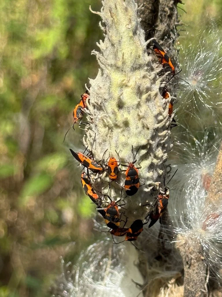 I chose to hike first…before I went into the building. I noticed a fall dogwood, milkweed pods with milkweed bugs, the path lined with trees (many redcedars), a stump with well-defined rings, and a honey locust (big thorns all along the trunk).