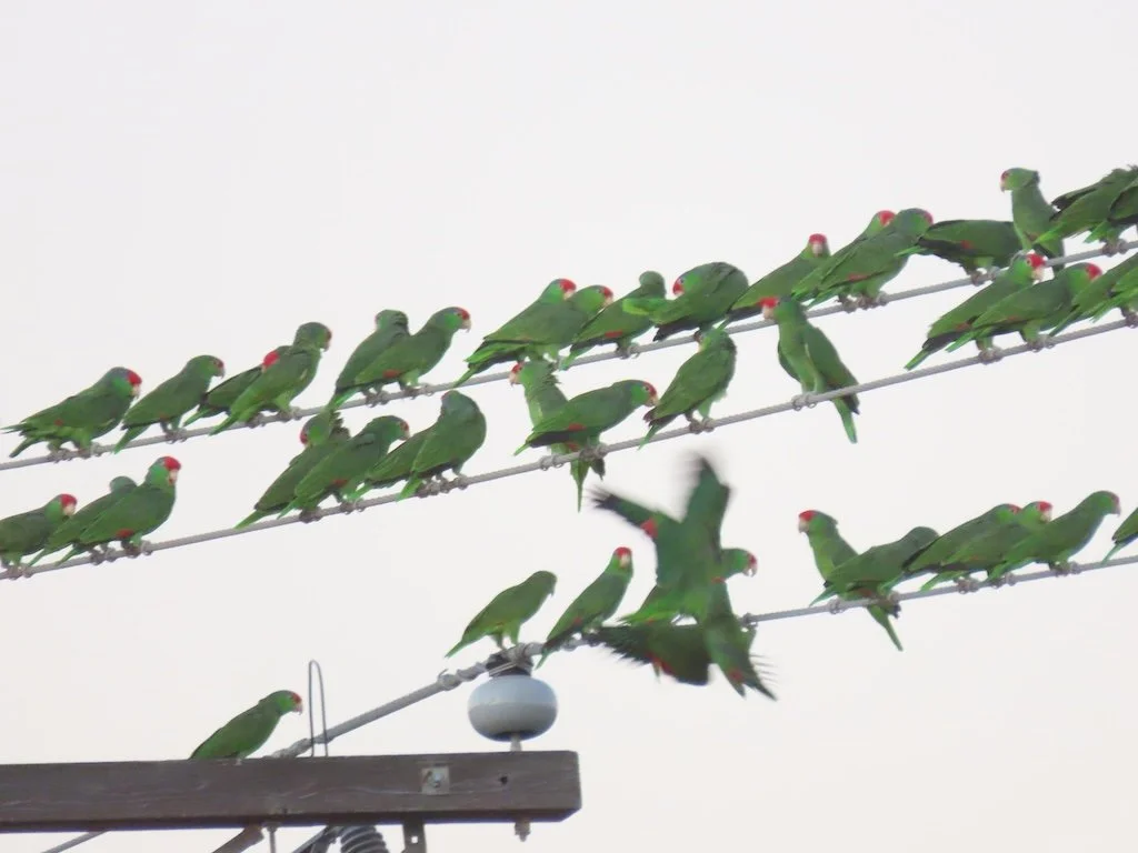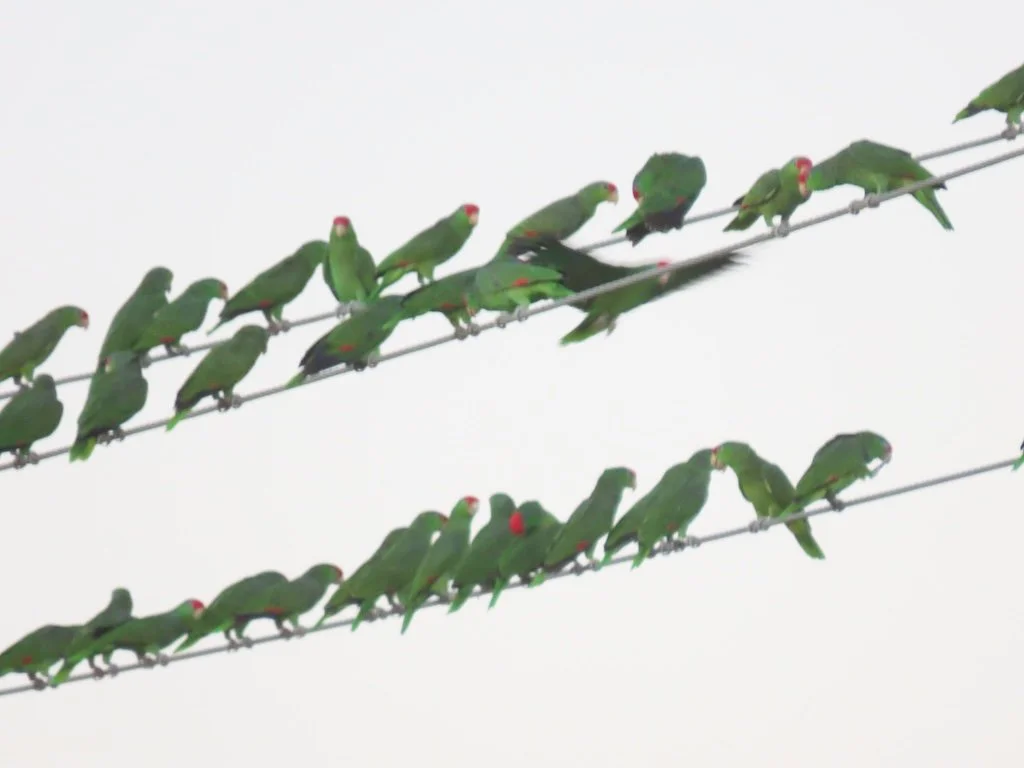 We went to a Whataburger parking lot first….and the green parakeets showed up to sit on the nearby wires about 5:45 PM! They sat in groups – preening each other.