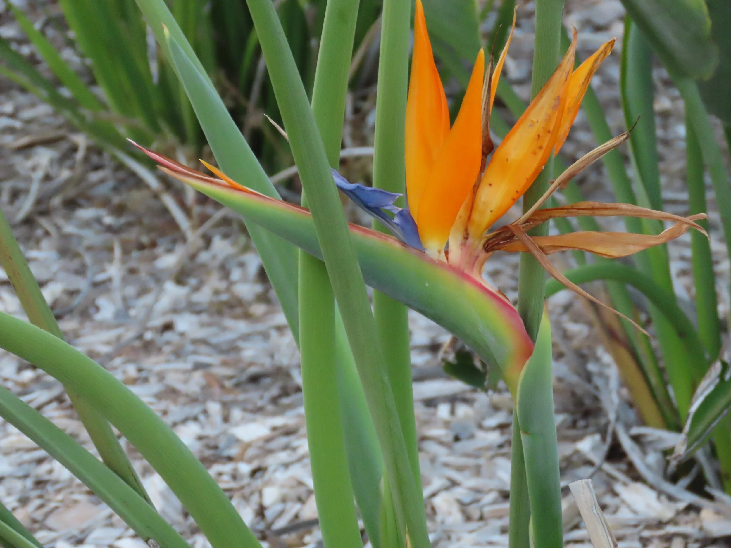 The red-crowned parrots were more elusive. We heard them in the air before we saw them. The van was parked in a church parking lot. There were a few parrots on a nearby line. I got bored enough to take a picture of a flowerbed with a bird of paradise plant!