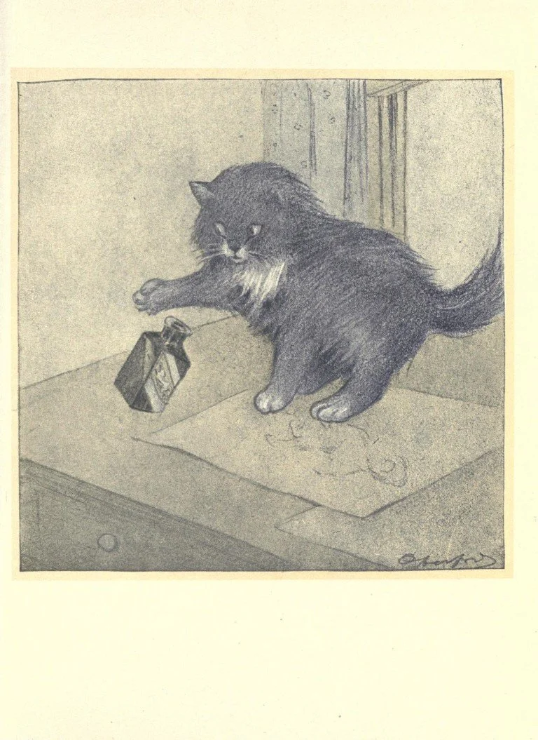 Oliver Herford’s The Rubáiyát of a Persian Kitten is available from Internet Archive…it was published in 1904 with his drawings….showing that the antics of kittens were as amusing more than 100 years ago as they are today. The swatting of the ink bottle on the desk might date one of the sample images I selected, but the motion of the kitten is familiar… and equally disastrous for any small breakable/spillable object on a counter or table…as we experience every day with our 3 kittens.